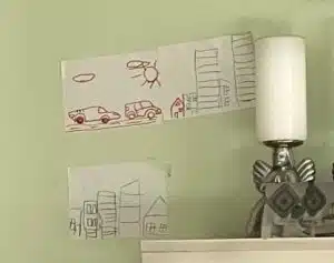 Duga część posta dotyczy kolejnego zdjęcia, gdzie widzimy dziecięce rysunki przyklejone do ściany: