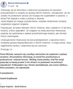 Odnosząc się do informacji o rzekomym postawieniu mi zarzutów prokuratorskich w związku ze sprawą SKOK Wołomin, oświadczam, że nie zostały mi postawione zarzuty ani niczego nie wyjaśniałem w sprawie, o której Pan napisał w mailu a później w artykule.