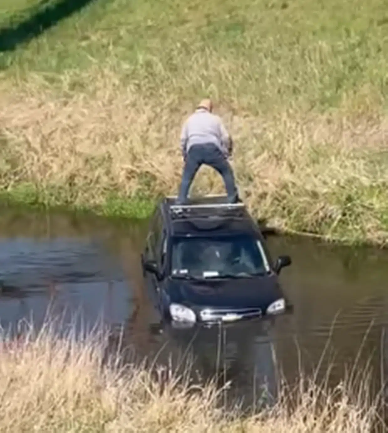 Mężczyzna wydostał się z pojazdu i wdrapał na dach. Kierowca stał na dachu płynącego pojazdu, a okoliczni mieszkańcy radzili mu, by wyskoczył na brzeg. W tym czasie też wezwano na miejsce służby.